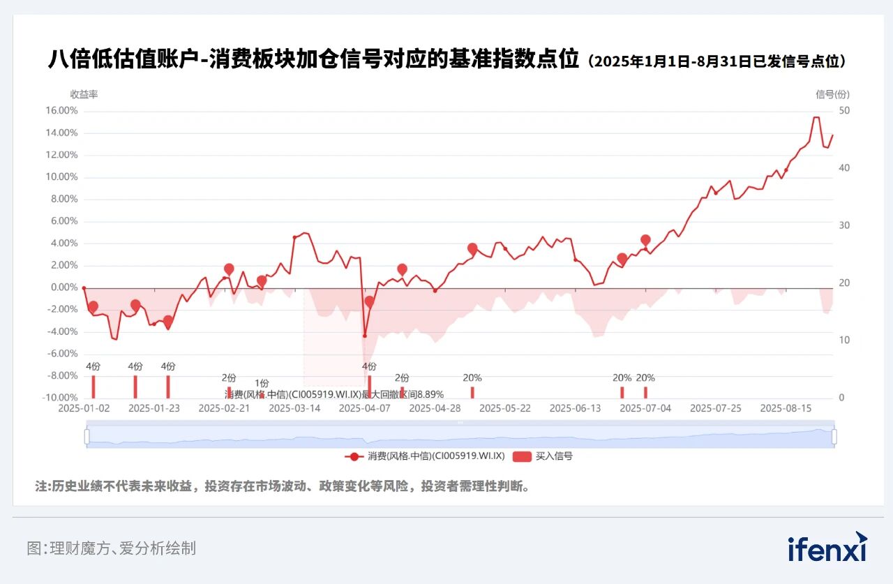 图:八倍低估值账户-消费板块2025年1月1日至8月31日已发信号点位情况(示例图)